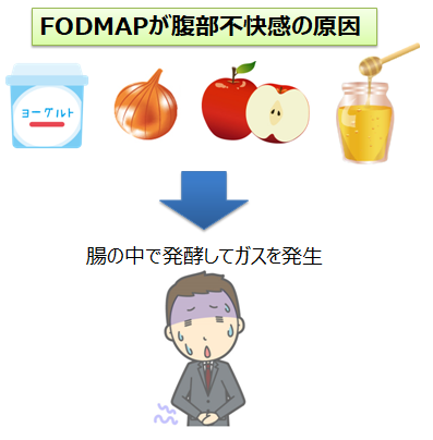 これらのFODMAPに該当する糖類は、大腸の腸内細菌によって発酵されてガスを生じます。その結果、お腹の張りをはじめとする腹部の不快感につながります。低FODMAP食では、このようなガスの元となる食品成分の摂取を控えることがポイントとなるのです。