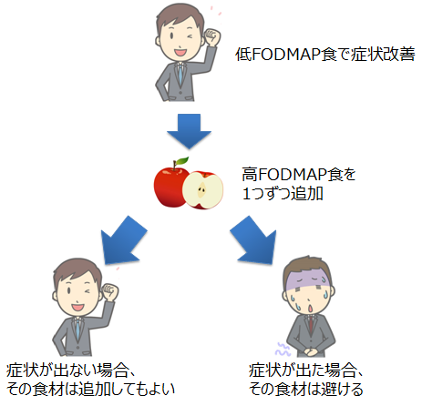 - 低FODMAP食に少しずつ高FODMAPの食材を追加することで、IBSの症状の原因となっている食材を突き止めることができる。