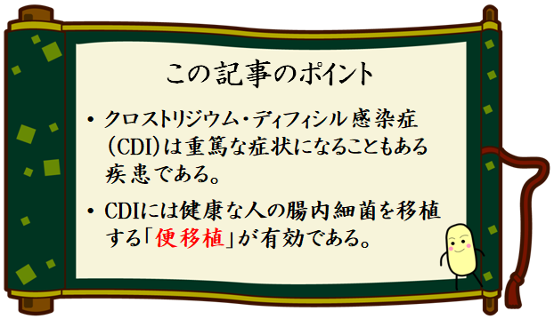- 健康な人の腸内細菌を移植する「便移植」は、とても合理的な治療法である。