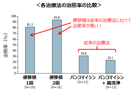 - 「便移植」は従来の治療法に比べて圧倒的に治療成績が高い。
